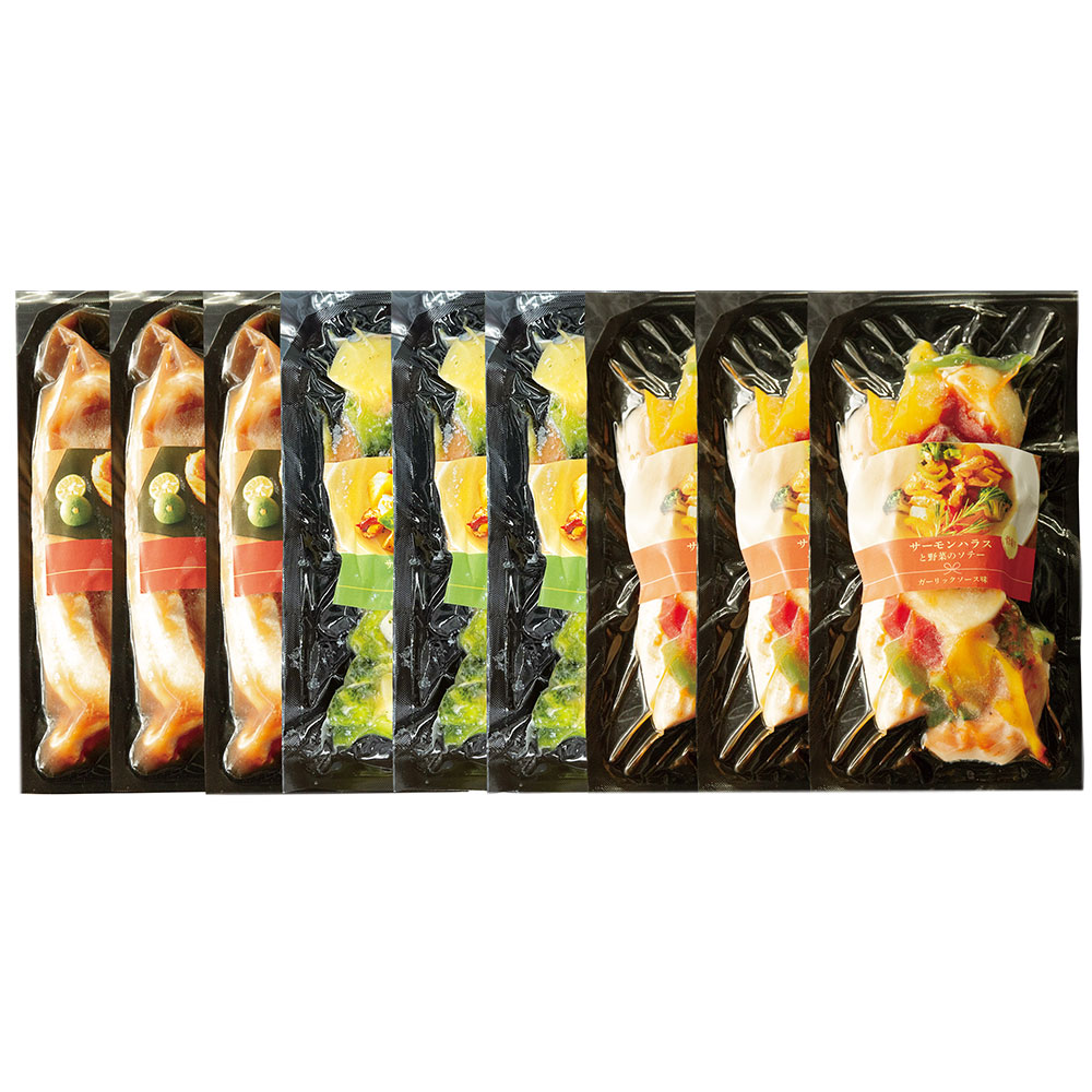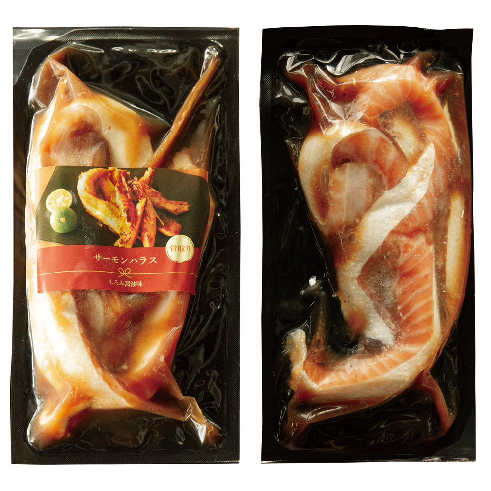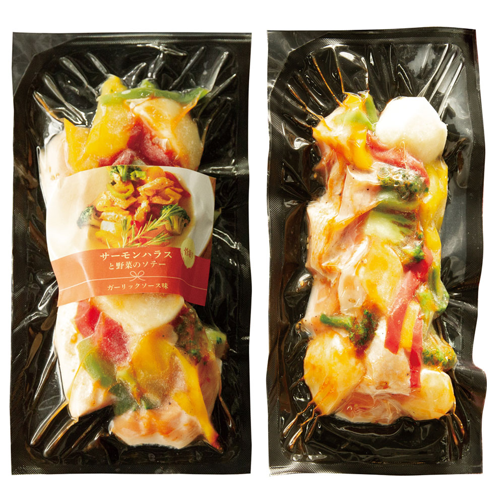 鮭の中でも高い人気のアトランティックサーモンのハラミ。野菜とフレンチ風ソースで2種類の洋風ソテーとオリジナルのもろみ醤油にじっくりと漬け込んだ和風のソテーの組み合わせです。下ごしらえ、味付けされているのでサッとフライパンで簡単に調理でき、さらに骨とりずみなのでお子様やご高齢の方にも安心してお召し上がりいただけます。