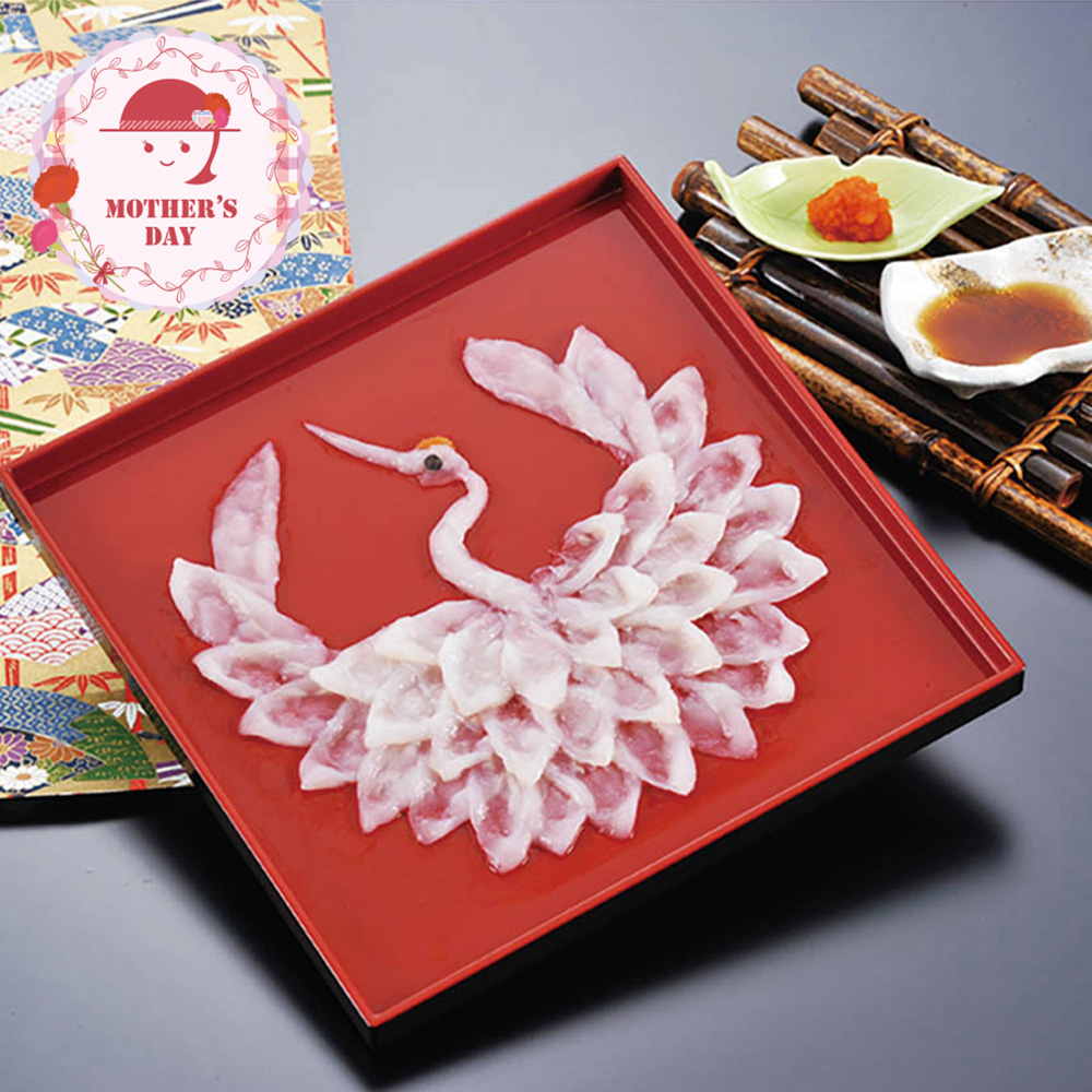 ■規格:まふく刺身鶴盛り50g(目:トラフグ皮、頭:モミジオロシ)(21㎝角プラスチック皿)、ポン酢10g×2、モミジオロシ3g、「お母さんありがとう」のメッセージ入りしおり