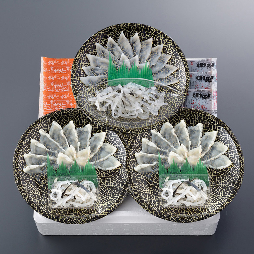 ■規格:とらふぐ刺身(17cm皿)25g、とらふぐ皮20g、真ふぐ霜降り刺身(17cm皿)15g×2、とらふぐ皮5g×2、ふくポン酢10g×3、もみじおろし10g×3