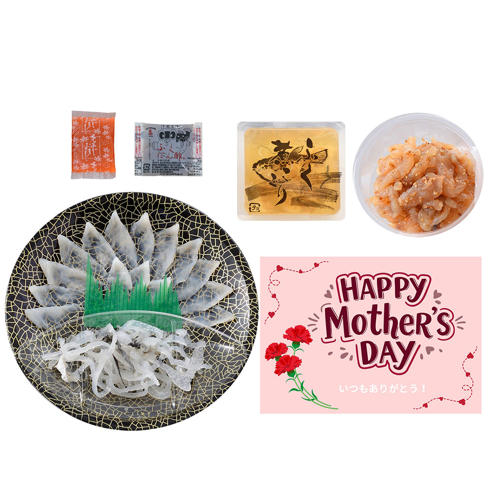 ■規格:とらふぐ刺身(17cm皿)15g、とらふぐ皮20g、とらふぐ塩辛60g、ふぐ煮こごり100g、ふくポン酢10g、もみじおろし10g ※母の日カード付