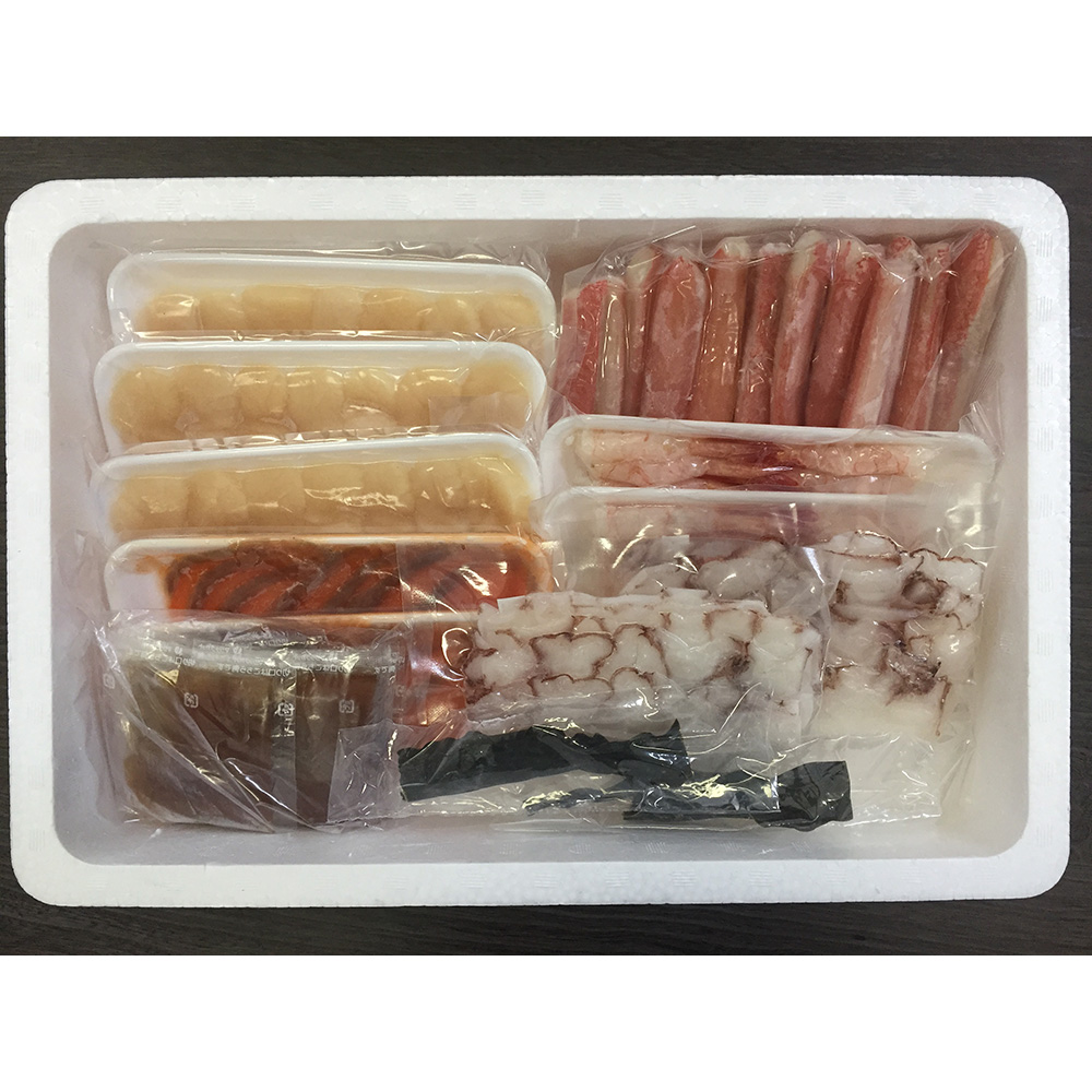 ■規格:生ずわいがに棒ポーション300g×1、たこスライス100g×3、生甘海老(尾付むき海老)10本×2、生帆立貝柱スライス100g×3、トラウトサーモンスライス100g×2、だし用昆布5g×2、たれ(しゃぶしゃぶ用)15g×8