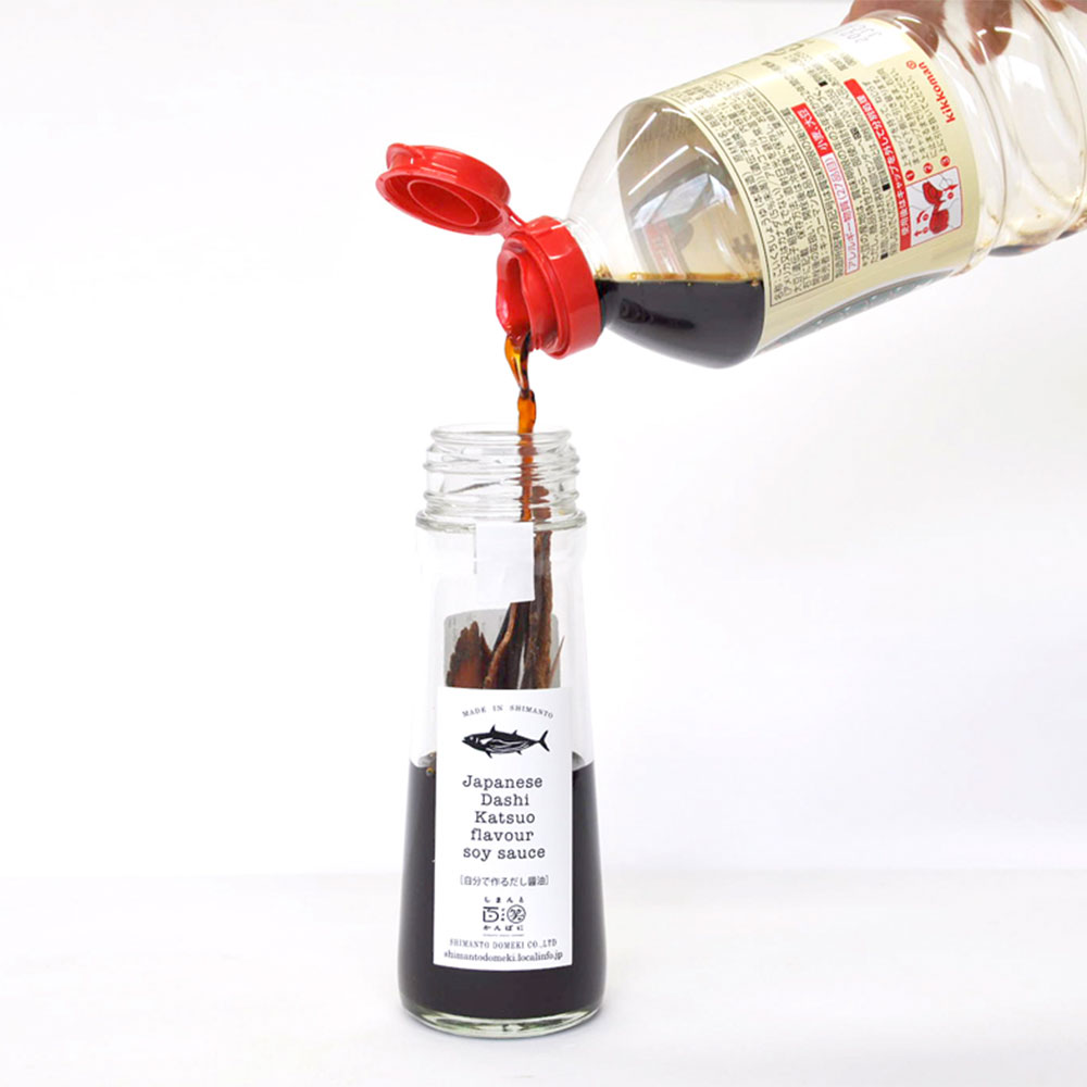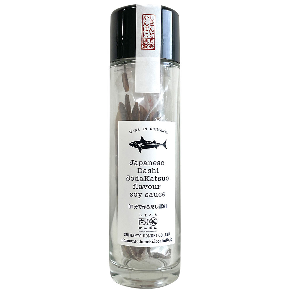 高知は宗田節の生産量が日本一。1月から3月に獲れる「寒めじか」と呼ばれる節の中では最高級とされる時期の原料のみ使用しているので、上品な香りでコクと旨味のあるよいだしがでます。いつも使っている醤油を入れ4~5時間すると宗田節の香り醤油ができあがります。卵かけご飯、冷奴、うどんやそばのだしに、おひたし、茶わん蒸し、炒飯、野菜炒めなどアイデア次第でいろいろご利用頂けます。だし醤油にお湯を注いで簡単スープとしても・・・少し贅沢な気分にしてくれる。蓋を開けて醤油を注ぐ。たったこれだけで、まろやかなだし醤油に生まれ変わります。醤油の好みは、生まれ育った地域などで、人それぞれ。『我家のだし』なら、お好みのお醤油で、お好みのだし醤油が作れます。じっくりと旨味が出る。だしの素からは、じっくり時間をかけて旨味が出ます。一度で出尽くしてしまうものではありませんので、醤油が半分程に減ってきたら継ぎ足して10回ほど使えます。グルメな方にオススメの醤油の素。刺身・炒飯・煮物などお料理に。また、卵かけご飯などに。かけ醤油・つけ醤油・調味料として、いろいろお使いいただけます。