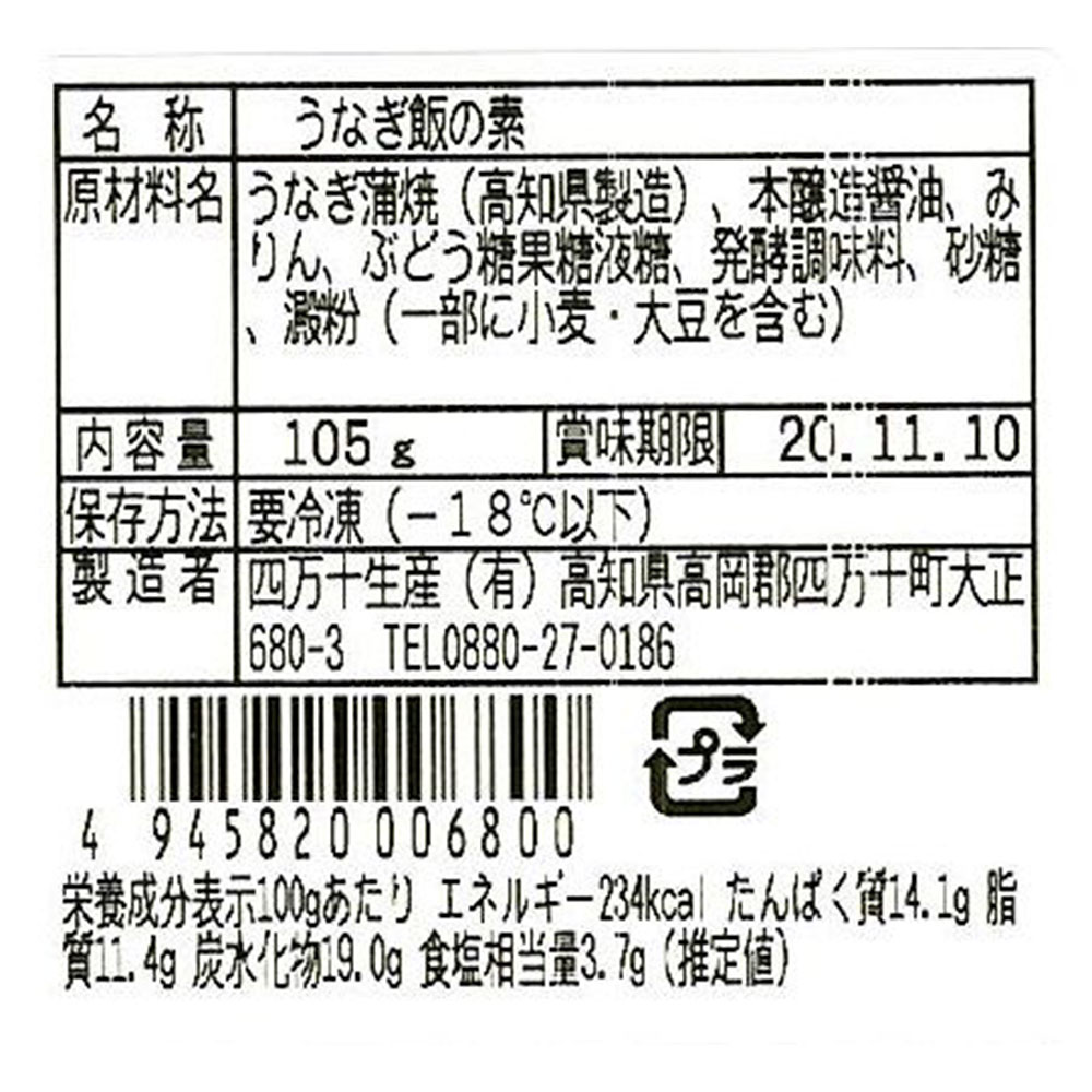■原材料名/食品添加物:うなぎ蒲焼(高知県製造)、本醸造醤油、みりん、ぶどう糖果糖液糖、発酵調味料、砂糖、澱粉(一部に小麦・大豆を含む)