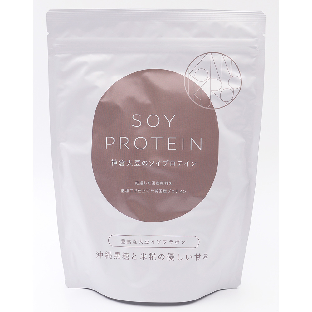 鳥取県三朝町(みささちょう)神倉(かんのくら)で古くから守り継がれてきた幻の地大豆「三朝神倉大豆」で作った国産原料のみを使用した国産のソイプロテインです。三朝神倉大豆のほか、国産の黒糖粉末(さとうきび)、米糀、食塩のみで作られており、人工甘味料、保存料、着色料、香料、防腐剤を一切使用しておりません。そのため、大豆の栄養をそのまま、安心して美味しく召し上がっていただけます。自然な優しい甘みは水や牛乳、ヨーグルトなどとも相性がよく、また超微粉砕することで溶けやすくなっておりますので、日常的に手軽に美味しくお役立てください。