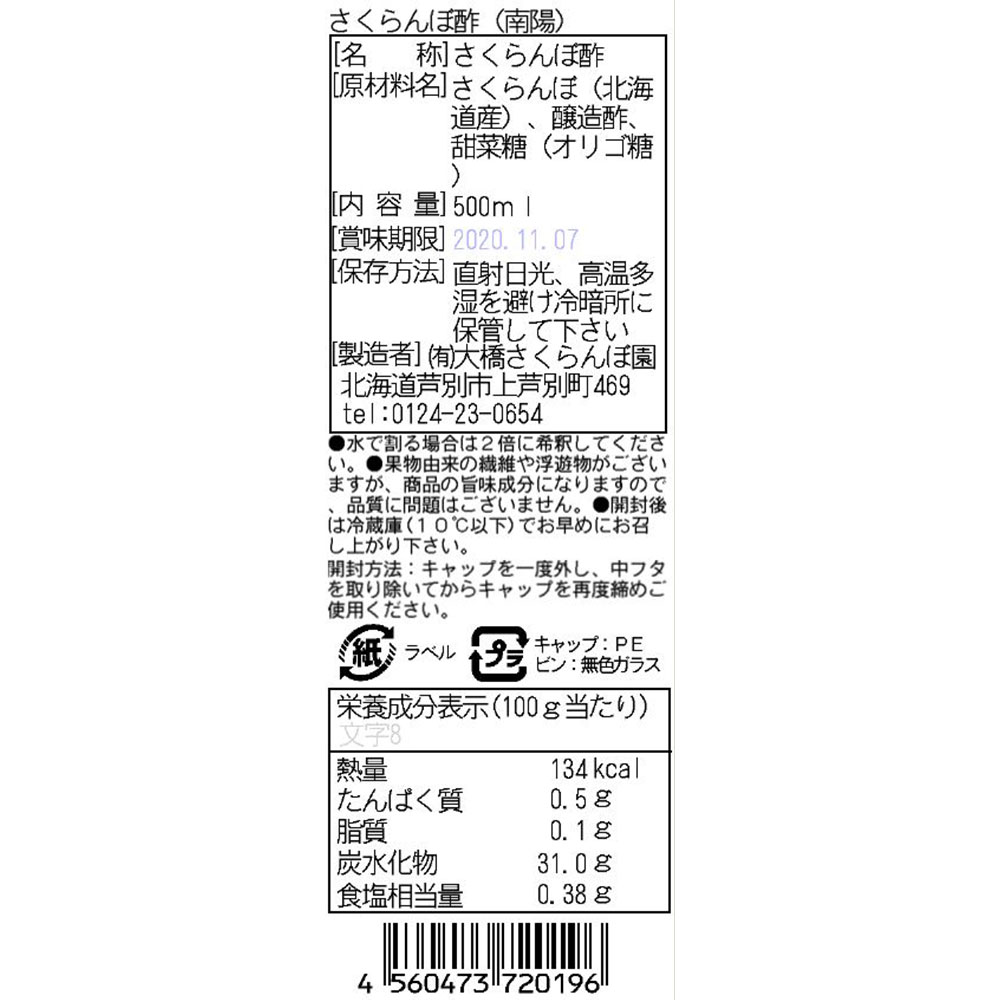 ■原材料名/食品添加物:さくらんぼ(南陽)(北海道産)、醸造酢、甜菜糖(オリゴ糖)