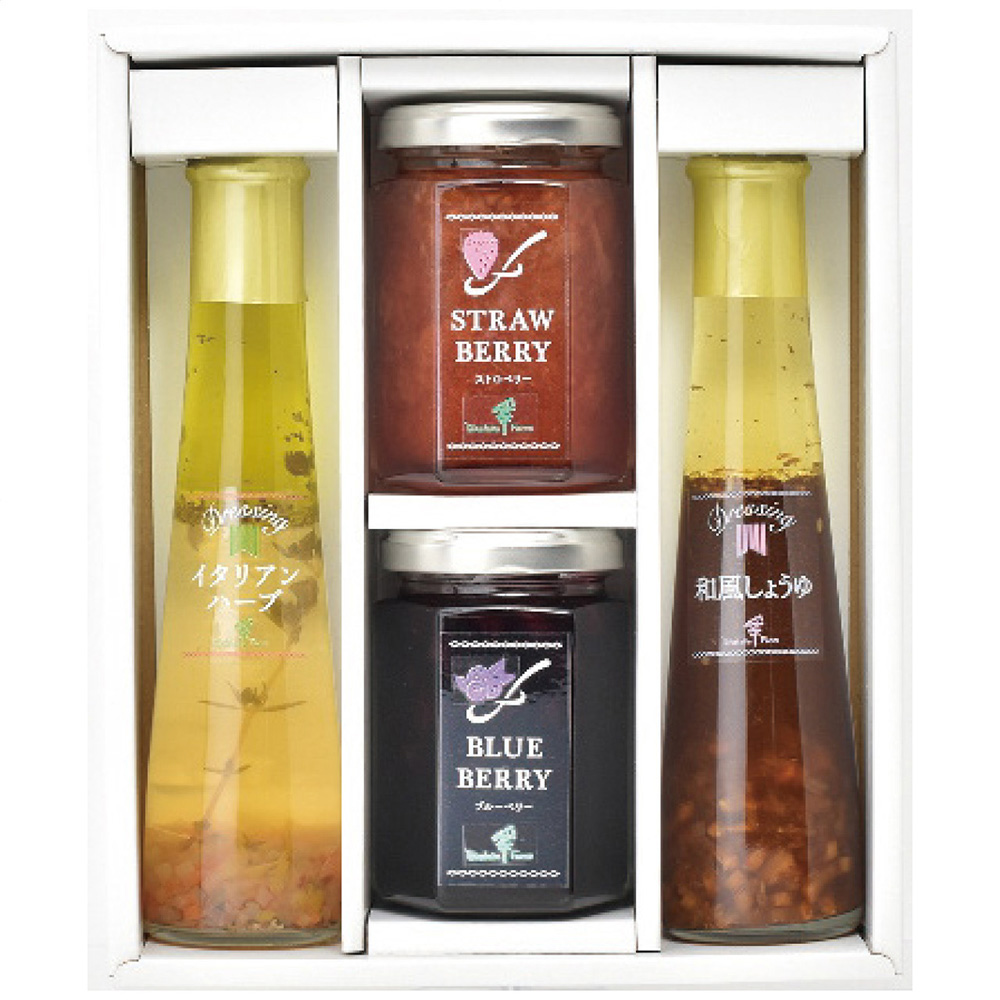 ■規格:ジャム145g(ストロベリー・ブルーベリー各1個)・ドレッシング122ml(イタリアンハーブ・和風しょうゆ各1本)