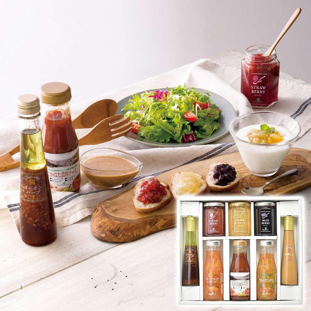 ■規格:ジャム145g(ストロベリー・ラフランス・ブルーベリー各1個)・ドレッシング122ml(オニオンハーブ・焙煎ごま各1本)・フルーツソース(グレープフルーツ&オレンジ220g・フルーツミックス215g各1本)・ソース210g(たかはた濃厚ソース1本)