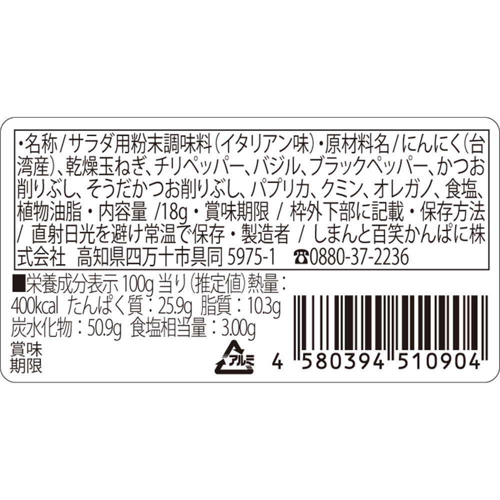 ■原材料名/食品添加物:にんにく(アメリカ産)、乾燥玉ねぎ(アメリカ産)、チリペッパー(アメリカ産)、バジル(エジプト産)、ブラックペッパー(インドネシア産)、かつお削りぶし(国内産)、そうだかつお削りぶし(国内産)、パプリカ(スペイン産)、クミン(インド産)、オレガノ(トルコ産)、食塩(国内産)、植物油脂(国内産)