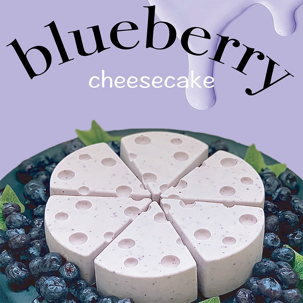 まるで絵本から飛び出してきたようなチーズケーキ。さっぱりブルーベリー味。