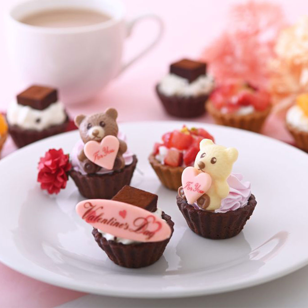 いちご果汁を加えたくちどけ滑らかなたっぷりのクリームに、バレンタインくまさんチョコが乗っています。クリームのふわっとした食感と、存在感のあるくまさんチョコをお楽しみください。くまさんチョコはミルクとホワイトの2種類です。