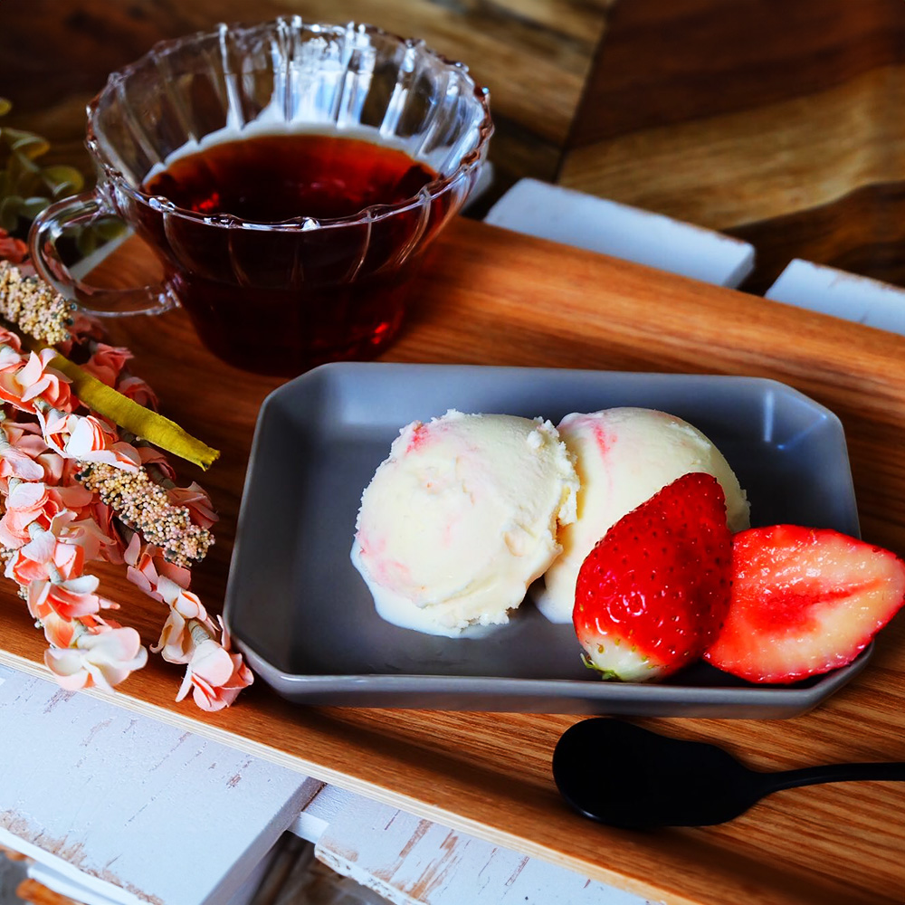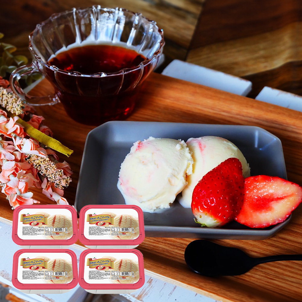 北海道産の乳製品を使用したバニラアイスに、いちごソースをマーブル状に混ぜ込んだホームタイプのアイスです。さっぱりした味のバニラアイスに、爽やかないちごソースを加え、飽きのこない味に仕上げています。
