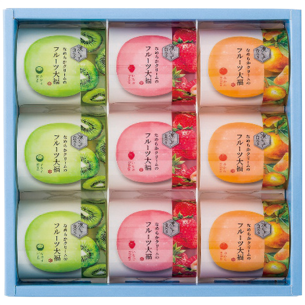 厳選したフルーツとコクのあるクリームを、もちもちのお餅で包み込んだ、甘酸っぱく、クリーミーな味わい。いちご・・・いちご果肉入りソース、クリーム、もちもちのお餅が合わさる華やかな味わい。みかん・・・みかん果肉入りソース、クリーム、もちもちのお餅が合わさる爽やかな味わい。キウイ・・・キウイ果肉入りソース、クリーム、もちもちのお餅が合わさるフルーティーな味わい。