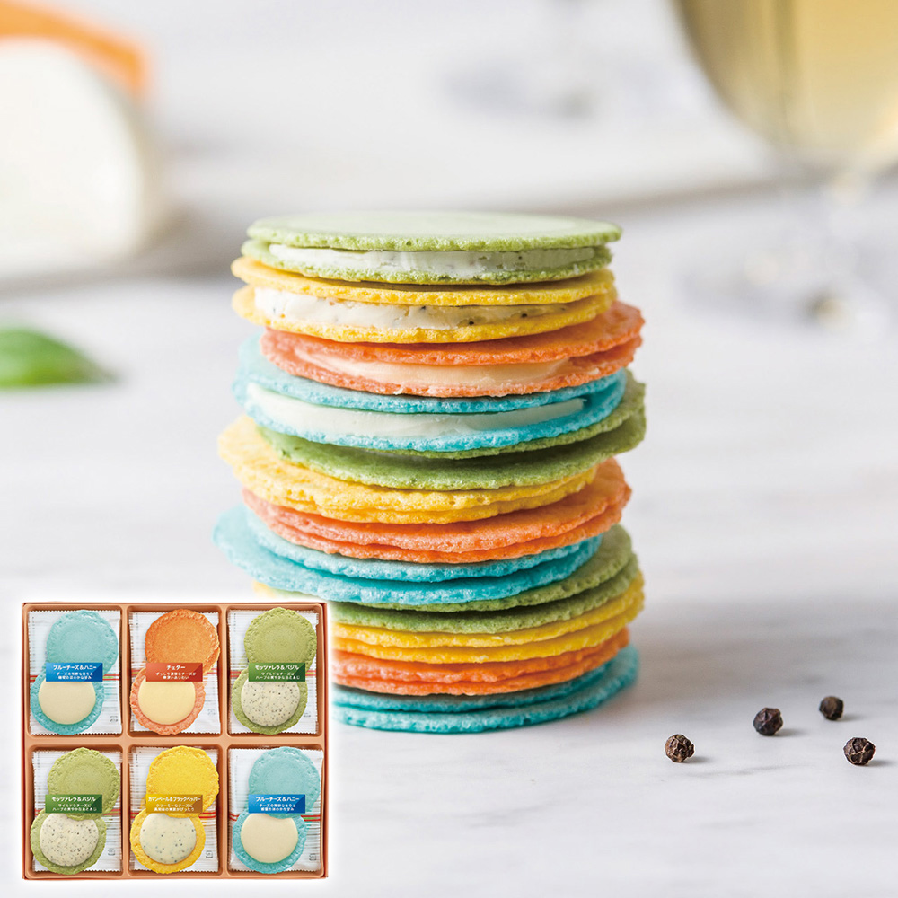 クアトロ(QUATTRO)とは、イタリア語で「4」を表す言葉。志満秀オリジナルの4種のチーズクリームをえびせんべいでサンドしました。