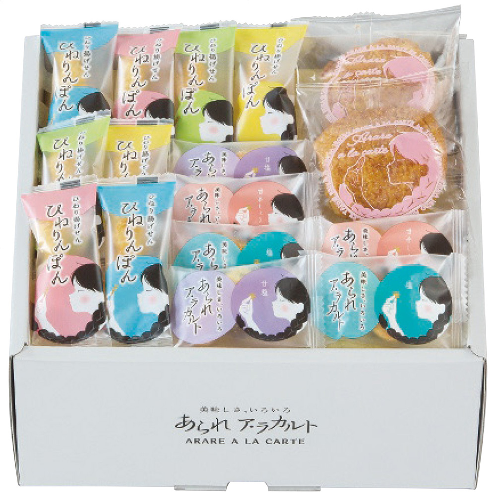 ふっくらソフトなおかきと、カリット揚がったひねり揚げと、あげせんのアソートです、味はおかきが「甘塩」「塩」「あまから醤油」の種類に、ひねり揚げの「塩」「カレー」の2種類、濃厚な味が特徴のあげせんの合わせて6種類のお味がお楽しみ頂けます。