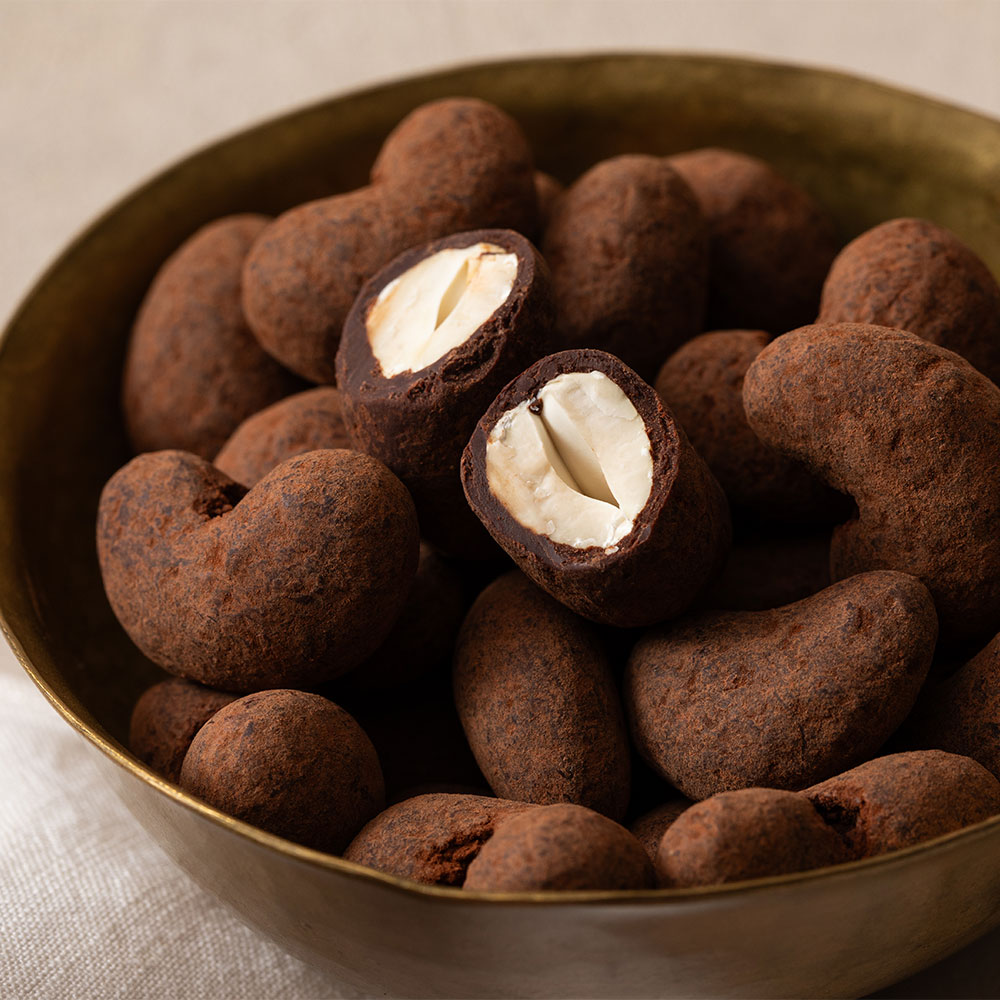 インドネシア・スラウェシ島産の大粒カシューナッツを丸ごとチョコレートで包み込んだ定番商品。生のカシューナッツが持つ自然な甘みと、カカオ分78%のダークチョコレートの組み合わせは、奥深い大人な味わい。