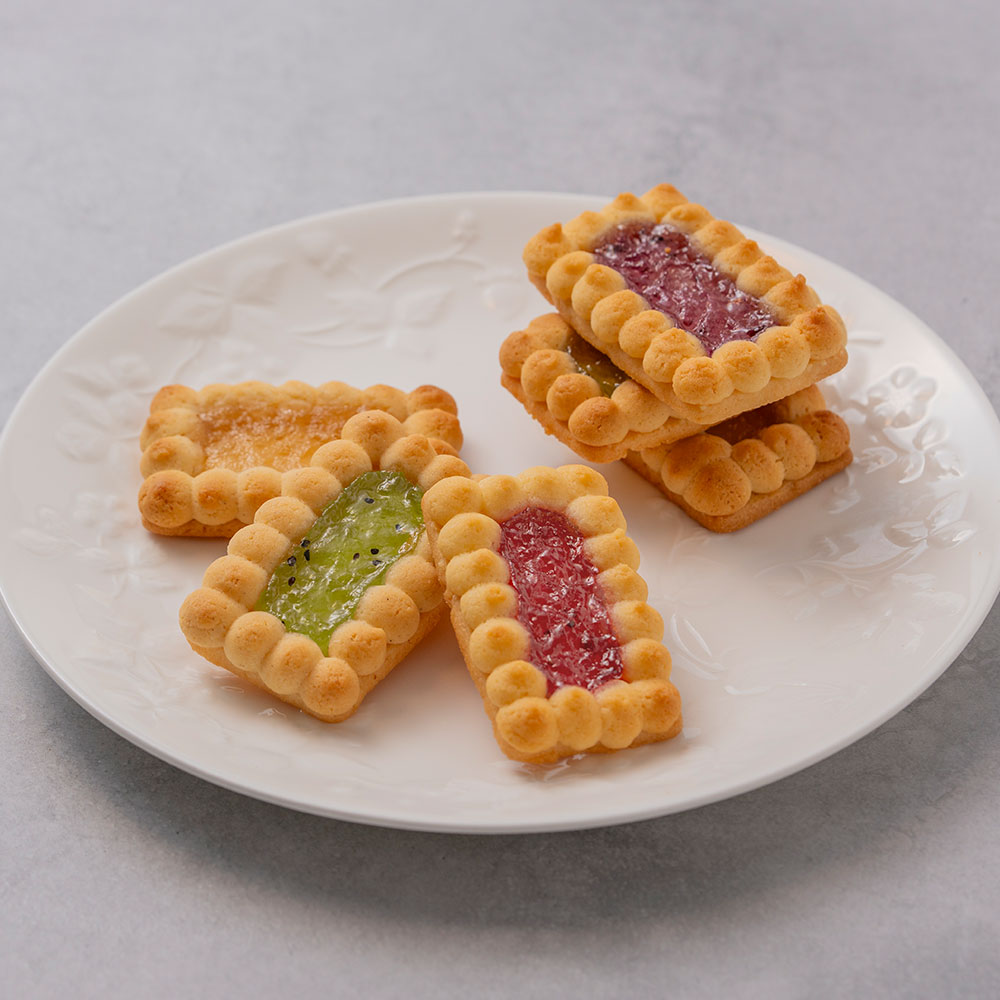 宝石のように彩り鮮やかな3種のフルーツジャムをのせ、しっとりホロッとほどける食感に焼き上げた二度焼きクッキーです。