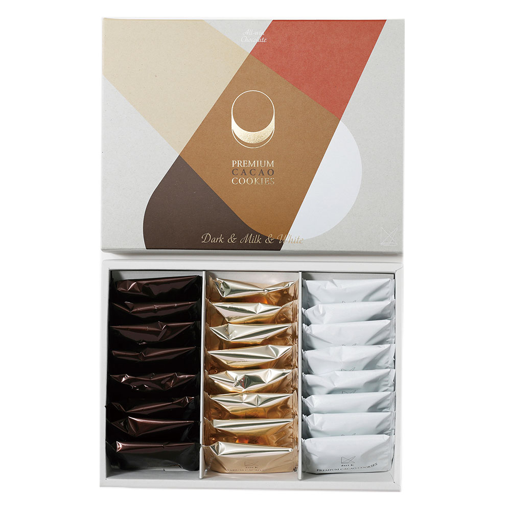 厚みのあるチョコレートをラングドシャ生地でサンド。カカオの重厚感と酸味が特徴の「ダーク」、優しい甘さの「ミルク」、ココアバター由来のコクが豊かな「ホワイト」。3種類のフレーバーが8枚ずつ入っています。