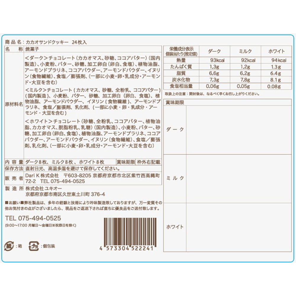 京都 「dari K」 カカオサンドクッキー24枚(ダーク・ミルク・ホワイト) 3種×各8枚 / ダリケー クッキー ギフト 送料無料