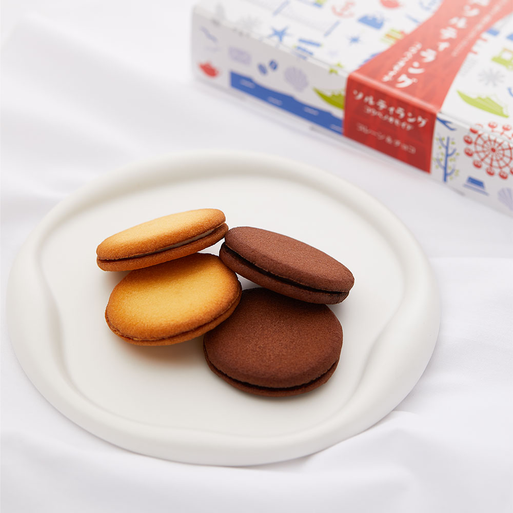 バターの風味豊かなラングドシャ生地にひと釜からほんの少量しか取れない貴重な「兵庫県淡路島産 藻塩」を効かせた甘さの中にほどよく塩味を感じるやさしい口溶けのラングドシャです。チョコタイプにはフランスヴァローナ社のチョコレートを使用しています。
