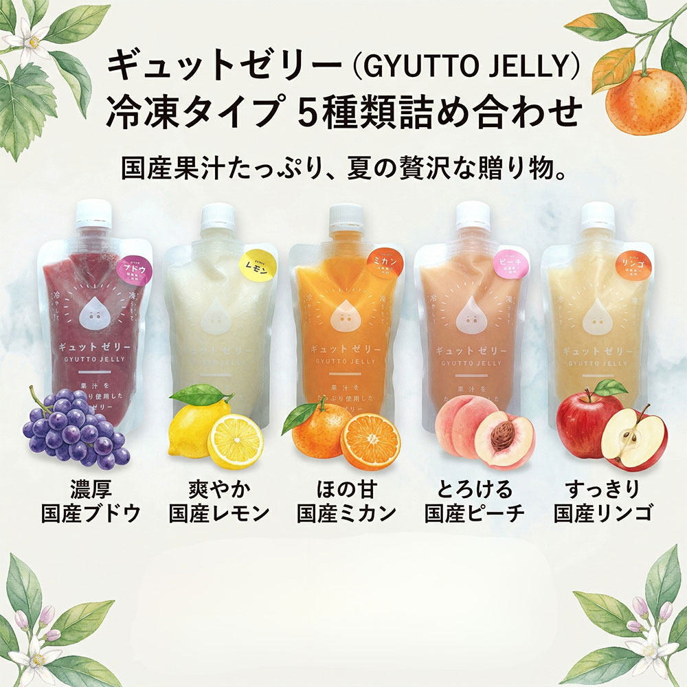 5種類(みかん、りんご、ぶどう、レモン、ピーチ)から自由に組み合わせを選べます。※冷凍でのお届けとなります。