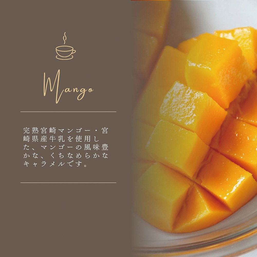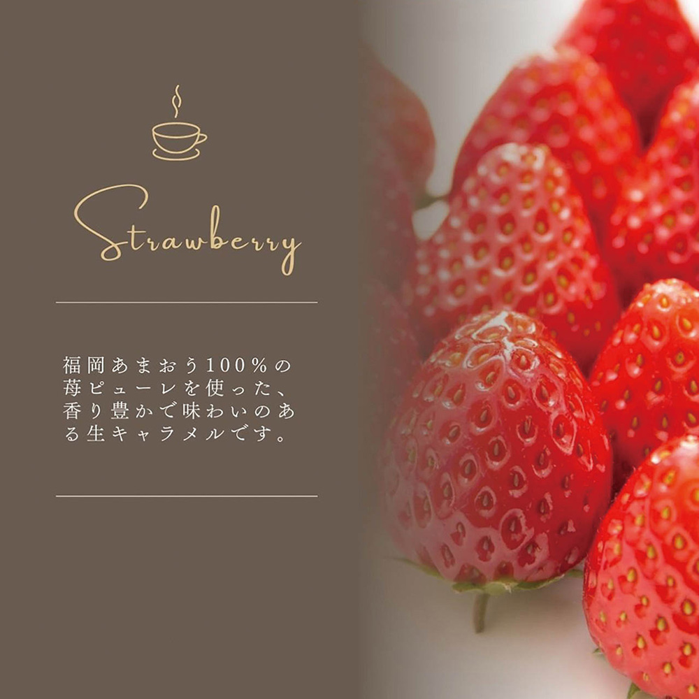 【あまおう苺】福岡あまおう100%の苺ピューレを使った、香り豊かで味わいのある生キャラメルです。【完熟宮崎マンゴー】完熟宮崎マンゴー・宮崎県産牛乳を使用した、マンゴーの風味豊かな、くちなめらかなキャラメルです。