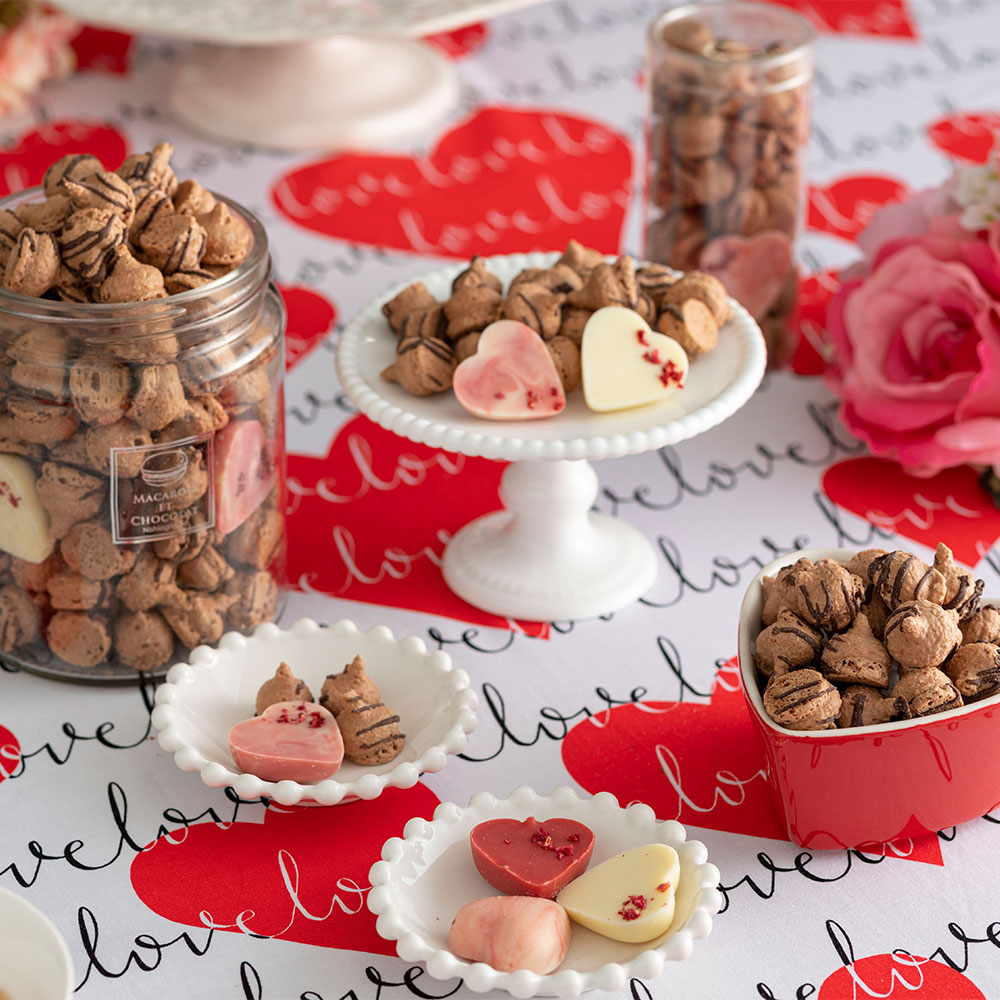 看板商品のマカロンの魅力をもっと手軽に味わってもらいたいという想いから創作したオリジナル商品が、マカロンボーロです。毎年大人気のヴァレンタイン限定マカロンボーロです。ショコラボーロにベルギー産のダークチョコをかけたビターな味わいと、ドライいちごをトッピングした3色のチョコがシックなマカロンボーロショコラに彩を添えています。