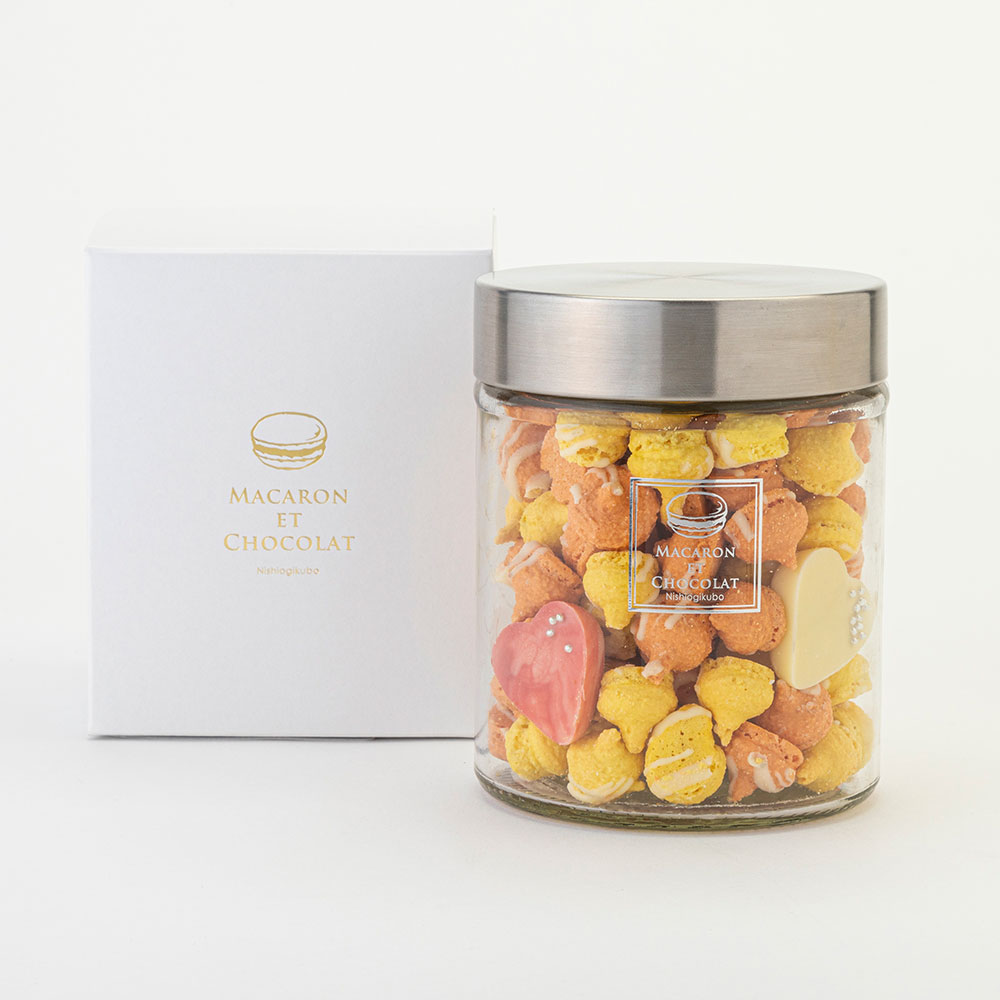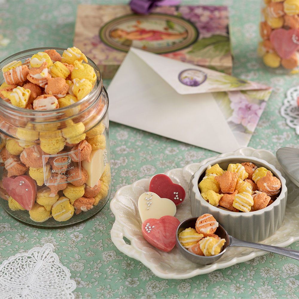 看板商品のマカロンの魅力をもっと手軽に味わってもらいたいという想いから創作したオリジナル商品が、マカロンボーロです。毎年大人気のホワイトデー限定マカロンボーロです。限定発売で大好評だったハニーとカラメルのマカロンボーロに相性抜群のホワイトチョコをかけました。トッピングのチョコモチーフはキラキラのアラザンをトッピングした3色のチョコが可愛らしさを演出します。