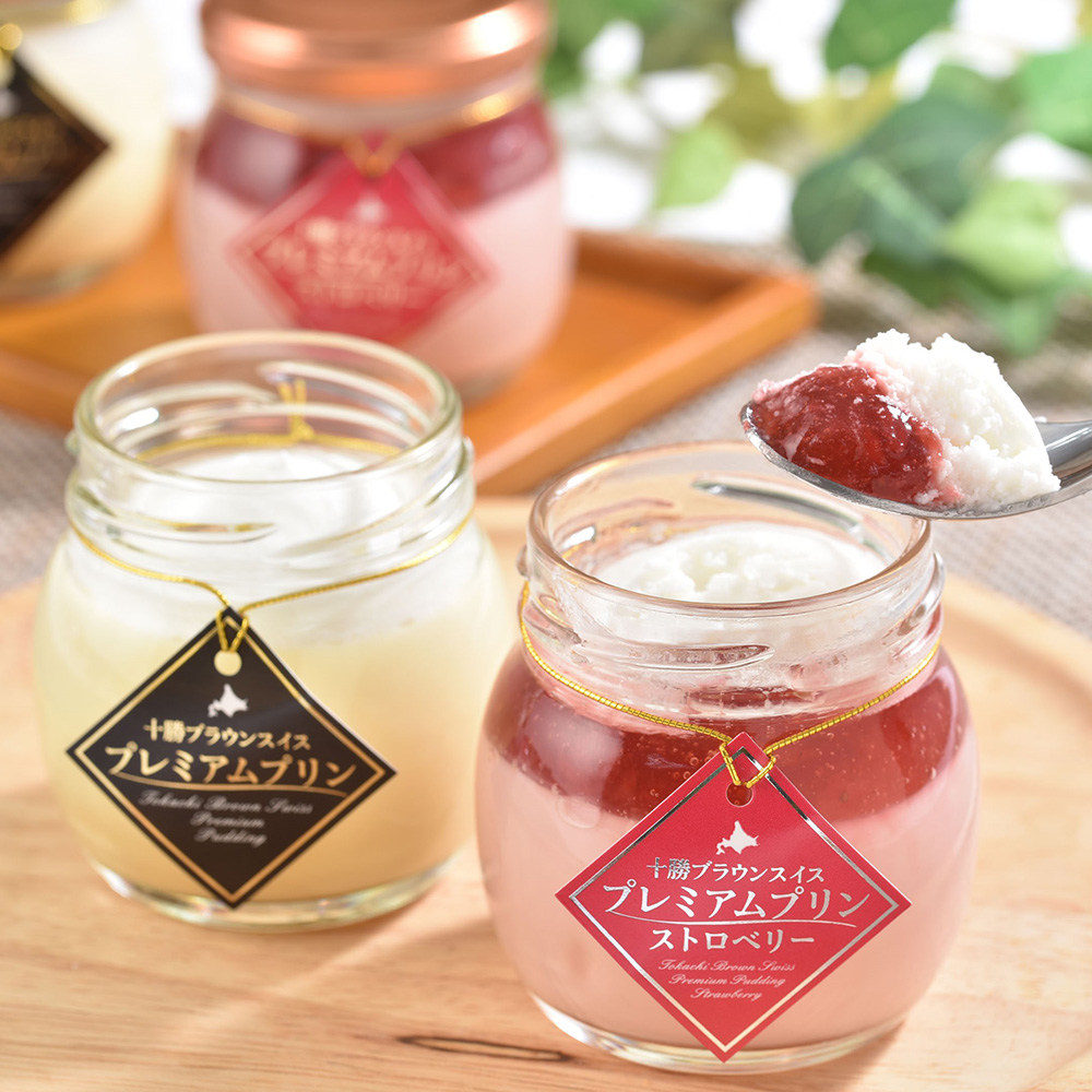 十勝橋本牧場の希少なブラウンスイス牛の生乳を使用したプリンセット。プリンに上はクリーム、下はカラメルソースが入ったプレミアムプリン。いちごプリンにいちごソース、クリームをのせたいちごプレミアムプリンのセットです。