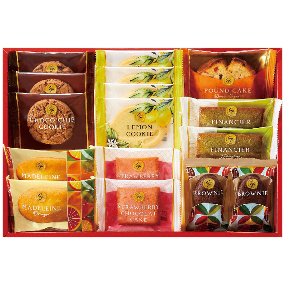 ■規格:オレンジマドレーヌ・ピスタチオフィナンシェ・ブラウニー各2個・ケーキ(ストロベリーショコラ2個・ブラウンシュガーパウンド1個)・クッキー(チョコチップ3個・レモン4個)