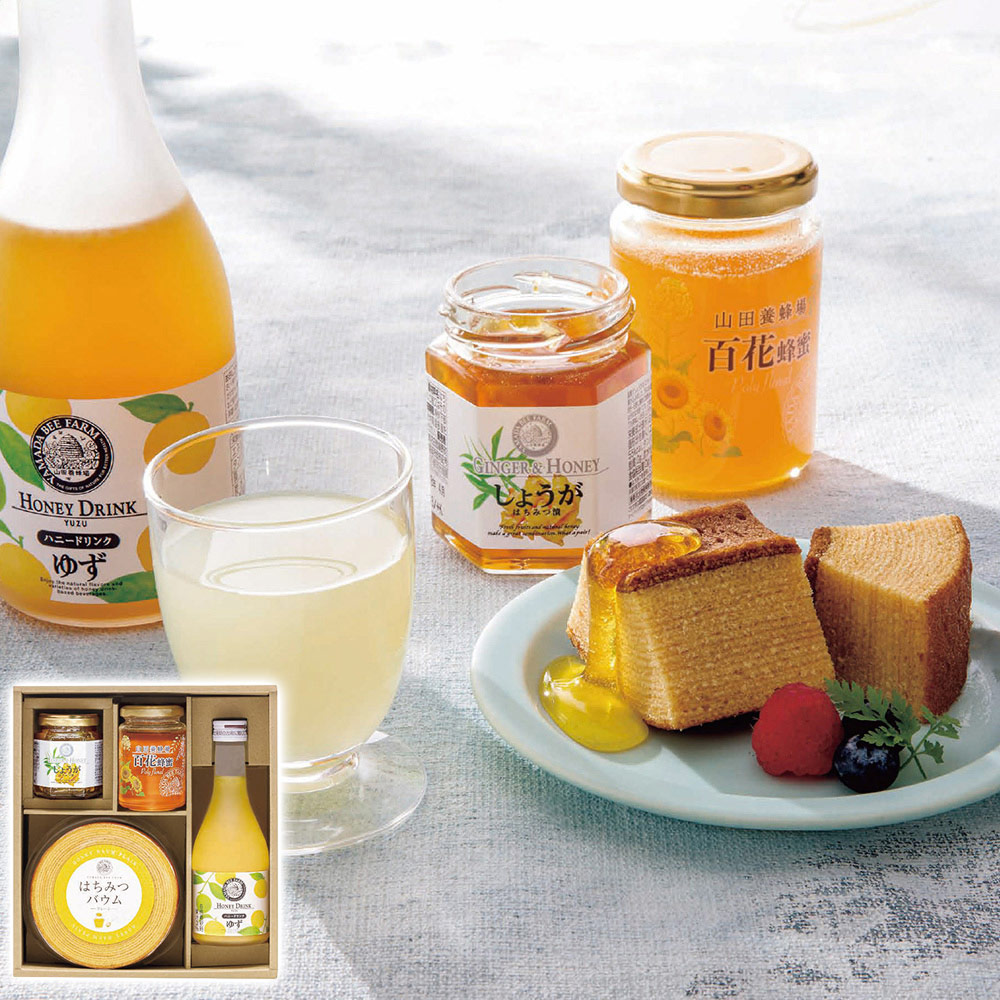 はちみつを加えしっとり焼き上げたバウムクーヘンと濃厚な甘みの百花蜂蜜、ゆずハニードリンク、しょうがはちみつ漬をセットにした食卓を彩るギフトです。
